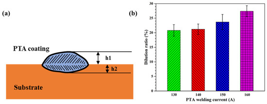 where is the thickness of the coating outside the surface of the substrate, and is the thickness of the remaining fusion zone in the substrate, as shown in Figure 8a. Using Equation (3), the dilution ratio of the Cu35Ni25Co25Cr15 HEA coating increased from 20.79% to 27.38% (see Appendix A for full data) as the welding current was increased from 130 to 160 A, as shown in Figure 8b.