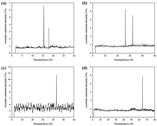 Acoustic emission spectra of the Cu35Ni25Co25Cr15 HEA coatings on the Cu substrate deposited under different welding currents: (a) 130 A; (b) 140 A; (c) 150 A; (d) 160 A.