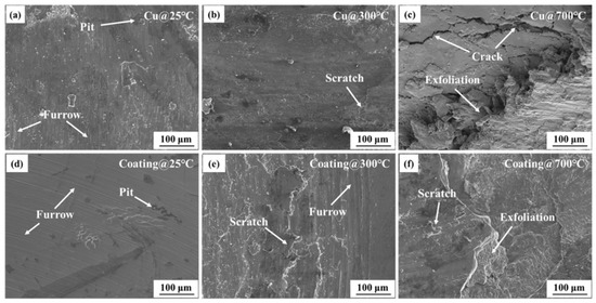Worn surface of the pure Cu and Cu35Ni25Co25Cr15 HEA coating deposited under a welding current of 150 A at different temperatures: (a,d) 25 °C, (b,e) 300 °C, and (c,f) 700 °C, respectively.
