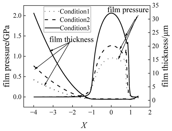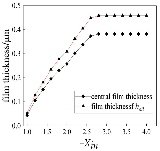Figure 3, it can be seen that the thermal effect does not change the film thickness as a whole. However, the minimum oil film thickness gradually decreases, and the oil film necking converges to the inlet area. The main reason is that the increase in temperature is not conducive to the formation of an oil film.