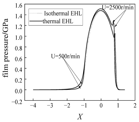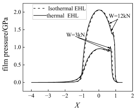 Figure 7, it can be seen that the pressure peak of thermal EHL is closer to the inlet region than that of the isothermal solution under consideration of a thermal effect.