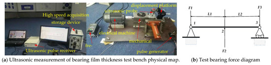 Figure 10a shows the bearing film thickness ultrasonic measurement test bench physical diagram, mainly by the bearing test bench, ultrasonic pulse receiver, high-speed acquisition and storage equipment, ultrasonic probe, micro-displacement mobile platform and other components. The function of the micro displacement moving platform is to adjust the position of the probe to facilitate the ultrasonic pulse into the bearing. The test bearing is installed at the right end of the main shaft and is fixed at the bearing seat by the outer shaft. In order to improve the lateral resolution of oil film measurement, and give the sensor a certain adjustment space, we choose the focal length F = 25 mm. The greater the frequency of the ultrasonic wave, the faster the attenuation, so we choose the center frequency of 50 MHz for the focusing probe. Considering the influence of improving the lateral resolution of film thickness measurement and its installation and debugging, the diameter of the piezoelectric element is selected as 6 mm. According to the frequency requirements, we select the DPR500-300M-RPL2 ultrasonic pulse receiver from JSR. Since the maximum frequency of the ultrasonic pulse is around 100 MHz, NI ’s PXIe-5160 acquisition and storage device is selected. Since only the film thickness of the bearing needs to be measured at low speeds, the motor model selected is YE2-80M2-4.