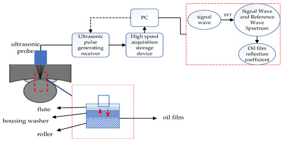 Figure 11 shows a schematic diagram of the principle of ultrasonic measurement of the film thickness of a roller bearing by placing an ultrasonic probe in a tank closely attached to the outer ring of the measured bearing. The ultrasonic probe emits an ultrasonic pulse wave into the water layer, and the ultrasonic wave entering the water layer reaches the water–water tank interface. Some waves are reflected, and some waves are transmitted into the water tank. The ultrasonic wave entering the water channel will eventually partially pass through the outer ring to act on the oil film layer and reflect. The reflected wave is finally detected by the ultrasonic probe after multiple transmissions.