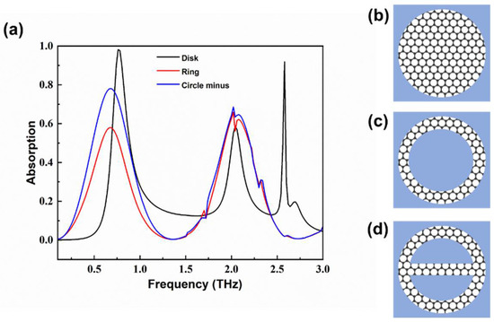 (a) Simulated absorption curves of proposed patterned graphene metamaterials absorbers. (b) Top view of disk-patterned graphene unit cell. (c) Top view of ring-patterned graphene unit cell. (d) Top view of circled minus-patterned graphene unit cell.