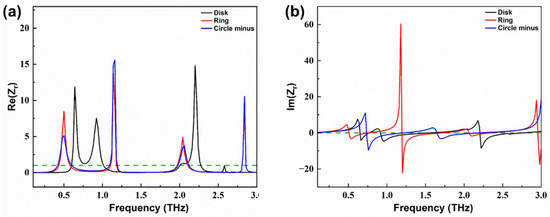 where represents the free impedance and is equal to the input impedance of the absorber. When the real parts are close to 1 and the imaginary parts approach 0, the designed THz metamaterial absorber can achieve perfect impedance matching. As illustrated in the real and imaginary parts of the relative impedance of the proposed THz metamaterial absorbers (Figure 4a,b), the ring-patterned graphene metamaterial and circled minus-patterned graphene metamaterials can satisfy the above condition in the frequency range of 0.58–1.1 THz, which means the impedance of ring-patterned and circled minus-patterned graphene THz metamaterials and the free space are nearly matched, while the impedance-matching band of the disk-patterned graphene metamaterial is relatively narrower.
