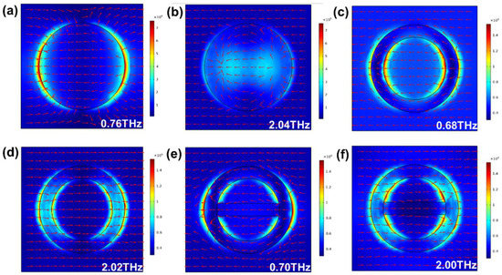 As for circled minus-patterned graphene metamaterials, the electric field distribution depicted in Figure 5e,f indicates that a clear dipole is formed in the outer ring of the structure and a quadrupole resonance mode is formed in the inner ring. The dipolar modes interact with each other and contribute to the absorption peak at the frequency of 0.70 and 2.00 THz. Such behaviors have been proven to achieve high absorptivity, as shown in Figure 3a.