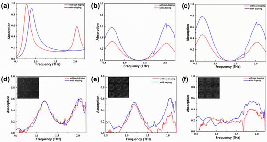 Simulated absorption spectra before and after doping process for (a) disk pattern, (b) ring pattern, and (c) circled minus pattern. Tested absorption spectra of undoped absorbers and doped absorbers for (d) disk pattern, (e) ring pattern, and (f) circled minus pattern with the optical image in the upper left corner.