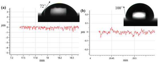 Roughness profiles and contact angle measurements: (a) untreated; (b) treated.