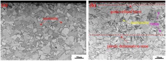 The metallographic images of the transversal sections with a magnification of 200 are shown in Figure 3. The microstructure of the matrix was a γ-austenitic structure, as shown in Figure 3a. For the treated sample, two zones were observed, namely, a deformation zone and a matrix, as shown in Figure 3b. There was no clear dividing line between the plastic deformation layer and the matrix. The thickness of the deformation layer was about 140 μm. There was a refinement layer of about 10 μm near the surface. In addition to many twins, deformation-induced αʹ-martensitic was observed in the USRP-treated surface. High-density dislocations were formed by severe plastic deformation during the USRP [8,23]. The grain refinement of 304SS was mainly achieved by a sliding dislocation network and twin segmentation that were formed by the dislocation transfer on the moving surface because of the low stacking fault energy [24].