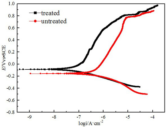 The polarization curves of the untreated and treated surfaces had the same trends, including a passivation zone and a pitting breaking potential, as shown in Figure 4. The corrosion potential (Ecorr) of the treated sample was higher than that of the untreated one, which was increased from −157 to −88 mV. The current density (Icorr) obviously decreased under the action of the USRP. The smaller value of Icorr for the treated sample indicated a lower dissolution rate of the passivation film. The critical pitting potential Epit, which was the potential at which the current density reached 100 μA·cm−2, increased from 0.85 V for the untreated sample to 0.97 V for the treated one. The increased Epit revealed that the pitting corrosion resistance of the USRP-treated sample was improved in hard water. Severe plastic deformation was able to result in a high surface residual compressive stress during the USRP treatment. The residual compressive stress was able to inhibit the metastable pitting in nucleation [20]. The residual compressive stress made the passive film more robust and compact because of the slightly lower interatomic distances in the underlying compressively stressed metal lattice [25]. This caused a lowered kinetics of the migration of point defects through the passive film, resulting in a lower current density value.