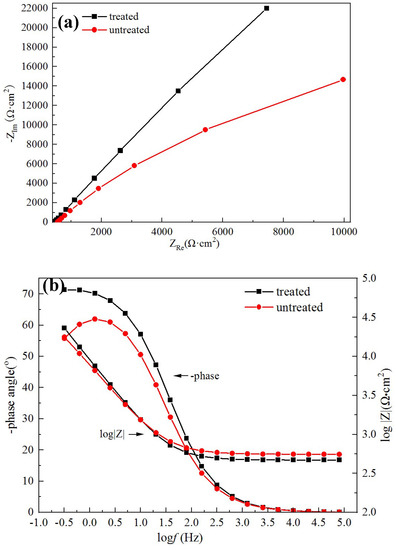 where f is the frequency. The dispersion coefficient reflects the density of the passive film, which generally ranges from 0 to 1, and a large coefficient value indicates a low dispersion effect. The smaller the value of Rs is, the faster the electrochemical reaction will be. The Rct value reflects the corrosion rate. Table 3 shows the parameters of equivalent electrical circuits in the EIS. It shows that the Rct value of the treated surface was improved, indicating that the corrosion reaction became more difficult. For the treated sample, Cd decreased and n increased, indicating that the diffusion effect decreases and the passive film became more compact.