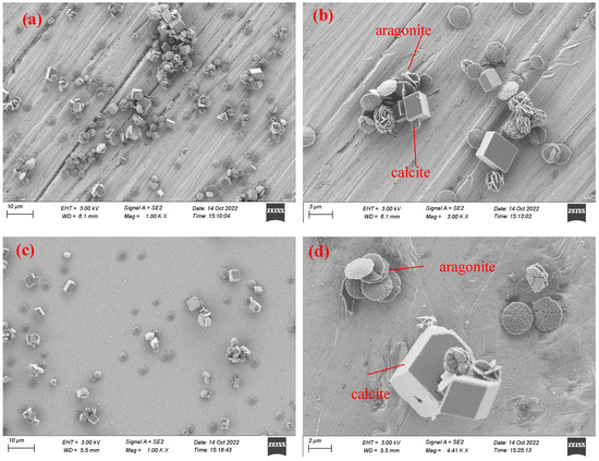 Figure 8 presents the fouling morphologies on different surfaces after 20 min for the fouling experiments. It was found that there was less crystallization fouling that adhered to the treated surfaces, as shown in Figure 8a,c. Compared with the untreated surfaces, the surface energy was reduced due to the larger contact angle, which reduced the adhesion of fouling. There is no difference in the crystal shapes of CaCO3 on the two surfaces, which were mainly discal and cuboidal, as shown in Figure 8b,d. In addition, it is found that fouling tended to obviously nucleate and accumulate around surface defects. This was due to the crystal surface defects resulting from surface defects, which could lead to a partial imbalance in the electrostatic interaction [21]. The negative ions and cations in some solutions were preferentially adsorbed onto the defects, resulting in increases in the concentrations of Ca+ and . Therefore, the partial supersaturation of the crystal species led to prior nucleation at the defects. As shown in the high-magnification images of Figure 8b,d, it was also found that CaCO3 crystals formed in discal aragonite and cuboidal calcite. Calcite had the best thermodynamic stability and the lowest solubility among the three crystal types of CaO3. Thermodynamically, aragonite was easily transformed into calcite. Calcite had stronger adhesion and was not easily washed away by water.