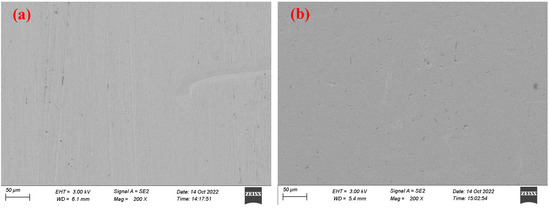 The roughness profile is shown in Figure 1. The roughness parameters of the surfaces are listed in Table 2. The value of Ra decreased from 0.190 μm for the base sample to 0.014 μm for the treated sample, and the values of Rz and Rv decreased significantly. The values of the parameter Rsk were strongly influenced by independent peaks or independent valleys. They were −0.166 and −1.014, respectively, for the treated and untreated surfaces. The value of Rsk of the USRP-treated surface was negative, and the absolute value was close to 0, indicating that the distribution of peaks and valleys on the surface was relatively uniform and the contour was smooth. The peaks and valleys of the treated surface were obviously blunter. Figure 2 shows the microscopic morphology of the test samples measured with SEM. For the original material, the surface was covered with grooves produced by the machining. Although there were still some defects, the surface of the USRP-treated sample became very smooth. Continuous plastic deformation played a predominant role in cutting peaks and filling valleys during the USRP. It is difficult for fouling to grow and deposit on smoother and flatter surfaces [21]. The USRP treatment reduced the nucleation points of crystal fouling by weakening the wave peak.