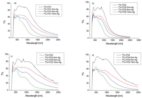 (a–d) Transmission spectra of ITO/glass substrates and Ag/ITO/glass structures for different ITO layers ((a)-ITO1, (b)-ITO2, (c)-ITO3, (d)-ITO4).