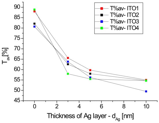 Figure 1 also shows the transmission spectra of the Ag/ITO/glass multilayers. The additional layer of silver nanoparticles causes a decrease in the transmission of the layer depending on the thickness of the layer of Ag nanoparticles, especially in the infrared region, which can be explained by the absorption of the light by silver nanoparticles. The dependence of the average transmission value in the visible region (380–780 nm) on the thickness of the silver nanoparticle layer for the tested samples is shown in Figure 2. It can be seen that the dynamics of the decrease in the average transmission value with the thickness of the Ag layer depends on the initial ITO/glass substrate. The slowest decrease in transmission occurs for the layer deposited on the ITO2/glass substrate.