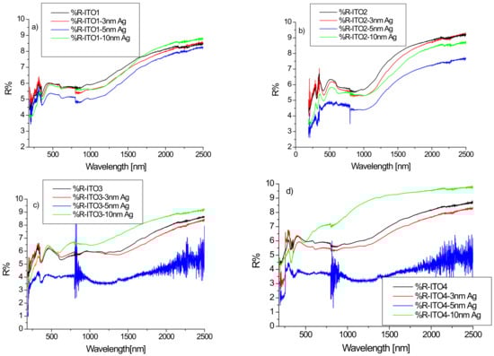 (a–d) Reflectance spectra of ITO/glass and Ag/ITO/glass layers for various ITO layers.