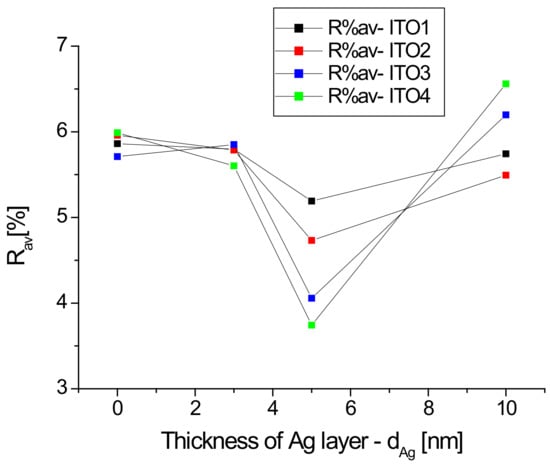 For all samples with a silver nanoparticle layer thickness equal to 5 nm, we observe a decrease in the average reflectance, which then increases for a thickness of 10 nm, while for Ag/ITO3/glass and Ag/ITO4/glass, the average reflectance at a layer thickness of 10 nm exceeds that for pure ITO (Figure 4). In the case of a thin layer (3 and 5 nm) of silver nanoparticles, light penetrates between the Ag grains and becomes “trapped”, which leads to a decrease in reflection. The increase in the R% av value when changing the thickness from 5 to 10 nm for each sample can be explained by the “mirror effect”, that is, when the layer of Ag nanoparticles is too thick, the layer begins to behave like a mirror. Thus, the previously described minimum reflection for a layer of 5 nm thickness can be explained.