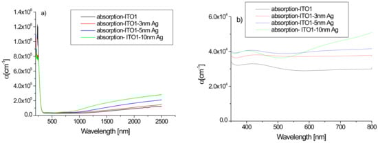 Figure 5 shows the absorption spectra of the tested ITO1/glass samples without and with an additional silver nanoparticle layer. The absorption spectrum of pure ITO1/glass correlates well with those presented in the literature []. Analysis of the absorption coefficient spectra of the films reveals the contribution from different absorption processes. In the ultraviolet region, the absorption is strong as a result of excitations across the fundamental band gap. The visible region is the transparency area of the layers. In the IR region, the main origin of the absorption is free carrier absorption. An additional layer of silver affects the absorption of the structure. In the infrared area, we observe an increase in absorption with the thickness of the layer of silver nanoparticles. The absorption coefficient in this wavelength range increases with the increasing thickness of the layer due to the increase of the free carrier density []. The changes in absorption caused by an additional silver layer are also visible in the visible area—the additional layer increases the absorption (Figure 5b).