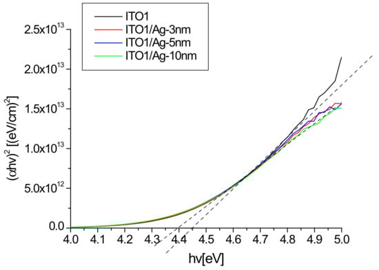 An example of the absorption graphs for ITO1 in Tauc’s coordinates is shown in Figure 6.