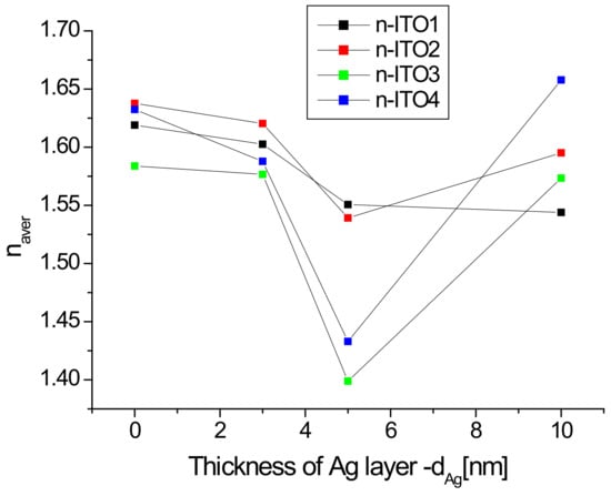 It is clearly visible (Figure 7a) that the refractive index varies in a very wide range of 1.1–1.6, while in the ultraviolet region, there is a rapid increase in its value with a decrease in the infrared region. In the infrared range, the value of the refractive index is significantly dependent on the presence of the silver nanoparticle layer and its thickness. The presence of an additional silver layer leads to a decrease in the refractive index, which decreases as the thickness of the silver layer increases (Figure 7). The refractive index of ITO/glass in the visible range does not differ much from that presented in []. The refractive index in the visible region changes slightly with the wavelength, therefore, its representative may be the average refractive index (nav). The calculated values of the average refractive index as a function of the thickness of the Ag layer are presented in Figure 8.