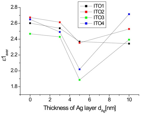 The dependences with a wavelength of the real part of dielectric constants for ITO1/glass with different thicknesses of additional silver nanoparticle layer are presented in Figure 9.