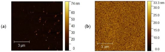 Figure 12a,b shows AFM images of the ITO 3 for 5 and 10 nm thickness of Ag nanoparticles, respectively. Based on our analysis, the surface morphologies for 5 nm have a more porous and granular structure than for 10 nm. However, for sample 10 nm, smooth and homogeneous morphology is becoming a ‘mirror-like’ structure, which is not desirable. Table 3 summarizes the roughness parameters for the initial ITO surfaces and surfaces covered with silver nanoparticles.