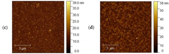 The topography of the selected samples was determined by atomic force microscopy (AFM, Park System XE-70) and was conducted at ambient pressure and room temperature. Figure 10a–d shows AFM images of the ITO1-ITO4 before Ag nanoparticle deposition. It is clearly visible that the structure and shape of grains of ITO substrates are different, which affects different growth mechanisms of the silver nanoparticle layers. It is visible for ITO3 and ITO4 with 5 nm Ag nanoparticles, Figure 11a,b.