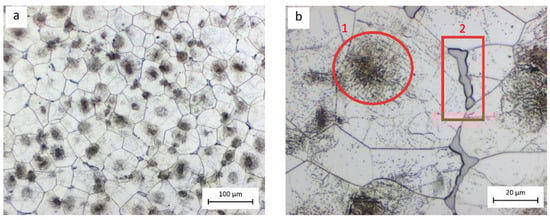 Microstructure of the cast EV31A-T6 Mg alloy after etching with Nital 2 []: general view (a) and high-magnification detail (b) showing Zr-Zn clusters at grain core (1) and residual eutectic microconstituent (α-Mg + Mg12NdxGd(1−x)) at grain boundaries (2).