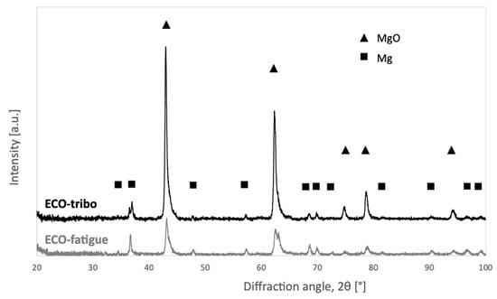 XRD analyses (Figure 5) revealed that MgO is the main crystalline constituent of the ECO layers. Also, peaks from the Mg substrate were detected, indicating that XRD patterns represent the coating’s full-thickness composition. The lower thickness of the ECO-fatigue layers led to a higher contribution from the Mg substrate than the thicker ECO-tribo layers.