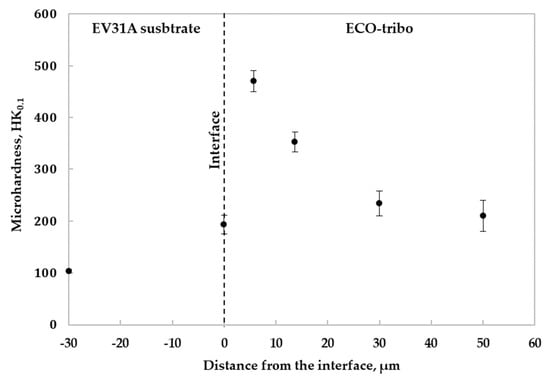 Figure 6 shows a representative HK0.1 vs. depth profile measured on the polished cross section of the ECO-tribo layer. The highest microhardness within the ECO layer (about 470 HK0.1) was found at about 6 μm from the coating-substrate interface, close to the base material. The microhardness value decreased towards the outer surface of the layer, reaching a plateau between 230 and 210 HK0.1 at about 30 μm from the coating-substrate interface. A similar trend was obtained by Durdu et al. [], even though with higher microhardness values; in particular, the highest microhardness was measured in the densest inner layer, approximately at 7 μm from the coating-substrate interface, while a decrease of about 50% was measured at 30 μm distance from it.
