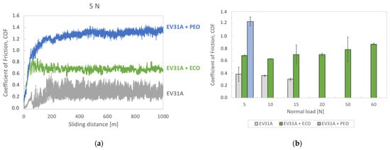 Dry sliding tests (vs. 100Cr6 steel, 1000 m, 0.3 m/s): dynamic COF as a function of sliding distance for untreated and ECO-treated EV31A at 5 N, compared to PEO-treated EV31A [] (a); average values of steady-state coefficient of friction for all tested conditions (data for PEO-treated EV31A at 5 N from []) (b).