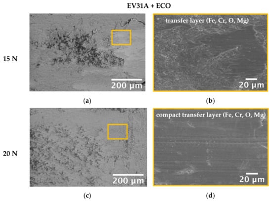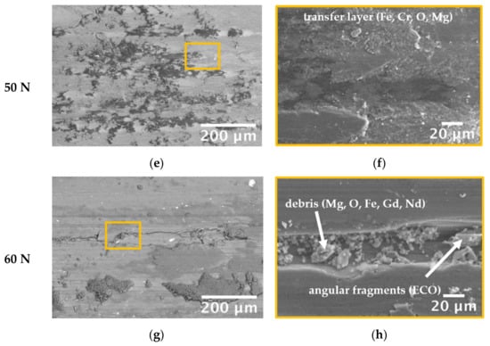 Conversely, the wear depth on the ECO-treated EV31A remains well below the thickness of the anodized layer in the load range from 5 to 50 N, and the worn surface was covered by the previously discussed iron oxide transfer layer, whose stability may also be accounted for the wear depth trend as a function of load in Figure 9b. The high-magnification observation of wear scars on ECO layers (Figure 11) showed that the transfer layer achieved maximum compactness and hence protective efficiency at 20 N (Figure 11c,d), leading to a slight wear depth decrease. Conversely, at 50 N the protective transfer layer started to be consumed (Figure 11e,f), and the wear depth increased (Figure 9b). At 60 N, the substrate appeared at the center of the wear scar (Figure 11g,h): inside deep grooves and plastically deformed areas, wear debris from the substrate and the anodized layer was detected. Angular fragments due to microcracking of the ECO layer were detected inside these grooves (Figure 11h). Microcrack-driven damage accumulation and coating removal in flakes are typically observed in anodic layers on Mg alloys involved in sliding contacts [].