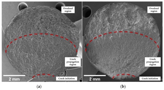 Fatigue tests (4-point rotating bending): SEM overview of the fracture surface of ECO-treated (a) and PEO-treated (b) samples, with distinct regions of fatigue failure.