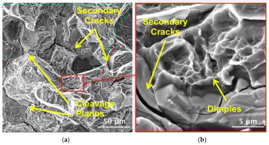 Finally, the overloading regions (Figure 15) are characterized by an inter-granular fracture mechanism with a brittle morphology, cleavage planes, and secondary cracks, surrounded by small areas with ultrafine deep dimples (Figure 15b), typical of local plastic deformation.