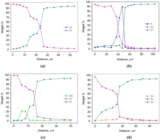 It should also be noted that the data obtained for samples with vanadium and molybdenum confirm the gradient nature of the diffusion layers. The existing transition zones with mutual diffusion of chromium and iron, observed on the graphs (see Figure 2), provide excellent adhesion of such coatings to the substrate, which coincides with the observed microstructure (see Figure 1), wherein the region of the STCT boundary there are no chips, cracks or pores in the layer with the matrix material. A similar microstructure, which ensures the adhesion of the coating to steel due to diffusion processes, can also be observed in laser cladding [36,37].