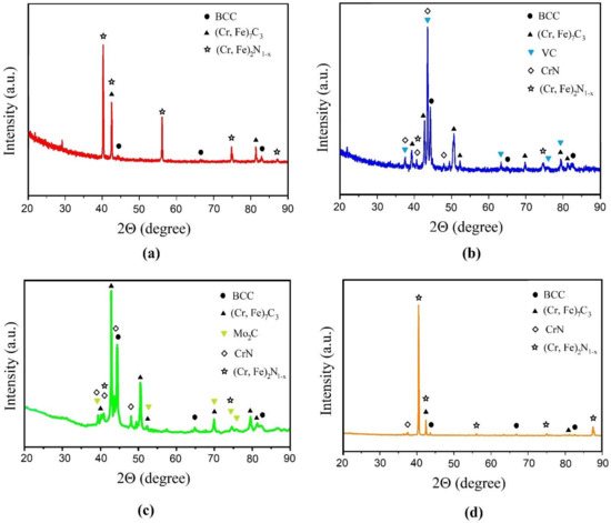 Table 3 shows data on the change in the Gibbs free energy of the formation of chromium, molybdenum, and vanadium carbides, as well as chromium nitrides at 1000 °C (according data from [39,40,41]). According to Table 3, the formation of chromium carbide Cr7C3 and chromium nitride Cr2N can compete with each other, as can be seen in the diffraction pattern for the sample without additives (see Figure 3a). Moreover, a similar picture can be observed for the Cr + 5% Co sample (see Figure 3d), since the formation of cobalt carbide is thermodynamically unlikely. At the same time, the formation of molybdenum Mo2C and vanadium VC carbides is thermodynamically preferable to chromium compounds, which is confirmed by X-ray phase analysis data. Some amount of carbide and chromium nitrides in Figure 3b,c can be explained by the small number of additives introduced (only 5%). It can be assumed that with an increase in their percentage, chromium carbides will practically not be formed. This assumption is supported by the data of the authors of [42], according to which, at the mass ratio in the used mixture FeCr/FeV = 35/65, after diffusion saturation, the layer consisted almost exclusively of vanadium carbides.