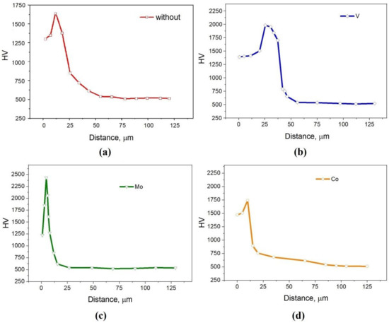 The microhardness values from the surface into the interior of the sample: (a) without additives; (b) with 5% FeV; (c) with 5% Mo; (d) with 5% Co.
