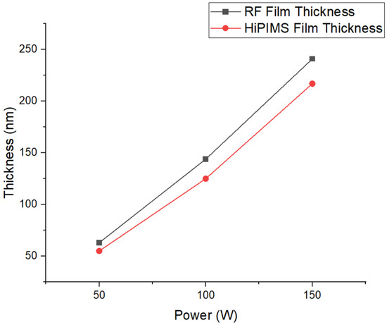 Plot of film thicknesses vs. average power for both RF and HiPIMS depositions.