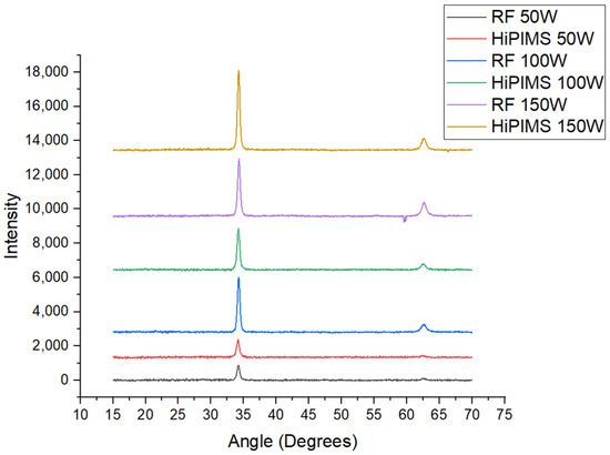 XRD diffractogram results displaying both the RF and HiPIMS depositions.