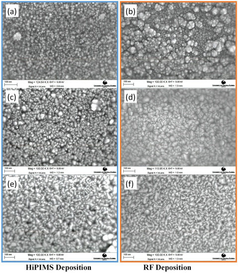SEM images of the investigated depositions. (a): 50 W HiPIMS, (b) 50 W RF, (c) 100 W HiPIMS, (d) 100 W RF, (e) 150 W HiPIMS, (f) 150 W RF.