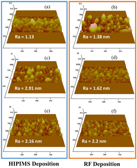 AFM-generated surface morphology plots, including the average roughness value of each deposition. (a): 50 W HiPIMS, (b) 50 W RF, (c) 100 W HiPIMS, (d) 100 W RF, (e) 150 W HiPIMS, (f) 150 W RF.