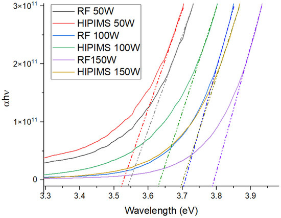 It can be seen in Figure 5 that the band gap increases with the increasing average power of the deposition. Consistently, the band gap was greater for the RF depositions reaching a maximum of 3.79 eV for the 150 W RF deposition.