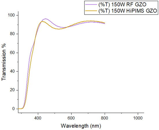 The refractive index of the RF 150 W deposition was found to be 2.45, and the HiPIMS deposition was found to be 2.4. These results are within the range of values to be expected in sputtered GZO [28].