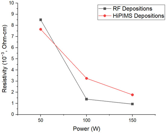 Using the hot probe test, it was found that all films exhibited n-type behavior as expected. The resistivity of the films was measured using a 4-point probe and based on the thickness of the films. The plots of the resistivities of the HiPIMS and RF depositions can be viewed in Figure 7.