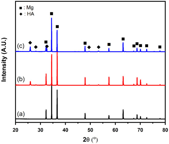 XRD spectra of (a) bare-, (b) HA-coated, and (c) PDRN/HA-coated Mg sample groups.
