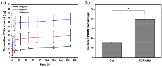 (a) PDRN release profile of PDRN/HA-coated Mg at various loading concentrations (200, 500, and 1000 μg/mL). (b) Total amount of PDRN released from Dip and PDRN/HA groups (*: p < 0.05).