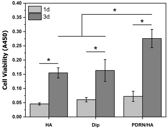 Cell viability of HA, Dip, and PDRN/HA groups measured using the MTS method (*: p < 0.05).