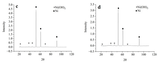 The X-ray diffractograms for the electrodes with the deposits are presented in Figure 2. In all the cases, the peaks for the metallic nickel and β-Ni(OH)2 were identified. The sizes of the crystallites were several tens of nm with lattice parameters of a = 3.1273 Å, c = 4.6439 Å. The Co(OH)2 reflects were not detected. This fact can be explained by a lower quantity of cobalt hydroxide.