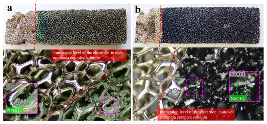 Typically, obtaining the nickel ammonia solution was achieved via two steps—the formation of Ni(OH)2 and its dissolution by NH4OH. In the first stage, 3.14 g of Ni(NO3)2·6H2O was dissolved in 20 mL of water and 2.46 g of KOH was dissolved in 40 mL of water. After that, the Ni(NO3)2 solution was added to the KOH at a continuous stirring rate of 770 rpm. The stirring was performed for 10 min. The obtained precipitate was filtered and rinsed once with water from the KNO3 solution on a paper filter. The last stage was the dissolution of the nickel hydroxide using 40 mL of NH4OH. As a result, a blue transparent solution of nickel ammonia complex was prepared. To form the Ni(OH)2-pure samples, four pieces of NF remained in a 15 mL nickel ammonia complex for 24 h. After the precipitation, the electrodes were rinsed in water and dried in the air for 24 h. The initial and final NF mass was controlled for all the samples on the analytical balance with an accuracy of ±0.00001 g.