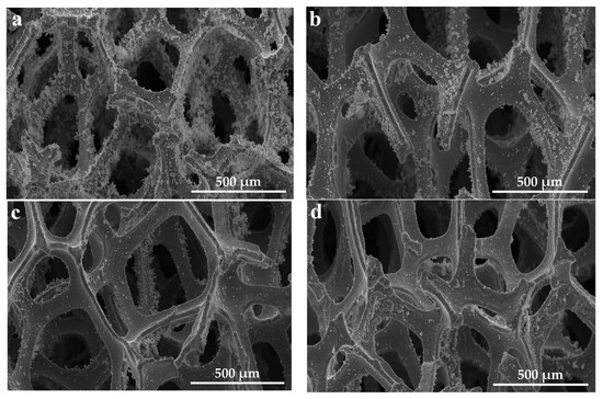 The morphology at a low magnification of the electrodes is shown in Figure 4. It is clearly seen that all the electrodes formed without PVP do not have branched particles. On the contrary, Figure 4a clearly demonstrates that the absence of PVP in the solution leads to the formation of highly branched particles on an NF surface. These particles resemble grey fur on the surface.